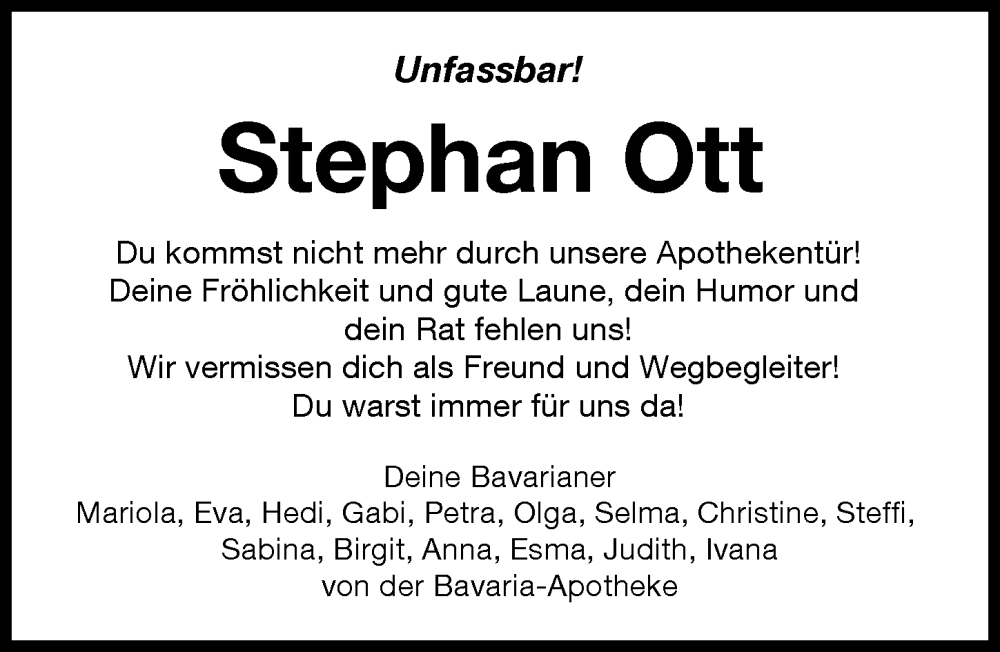 Am 13.10.2024 verstirbt Stephan Ott plötzlich und unerwartet im Alter von 71 Jahren. Das gesamte Team der Apotheke trauert um ihn – wer ihn kannte, weiß was wir verloren haben!
